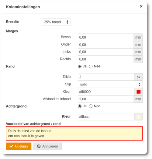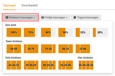Hierbij kunt u kiezen uit voorgedefinieerde indelingen (1,2,3 of 4 blokken op een rij) en breedtes (25% t/m 100%). Dit kunt u later nog allemaal aanpassen.