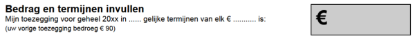 Het ligt voor de hand ook een blok met 'Betaalwijzen en/met maanden' (zie 1 en 2) op te nemen, daarin kan de geregistreerde de betaalwijze en termijnen aanvinken. Desgevraagd kan ook het vorige toegezegd bedrag worden afgedrukt.