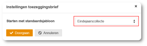 Het is beter om bij het starten van een sjabloon te kiezen voor Type toezeggingsbrief en vervolgens voor Eindejaarscollecte